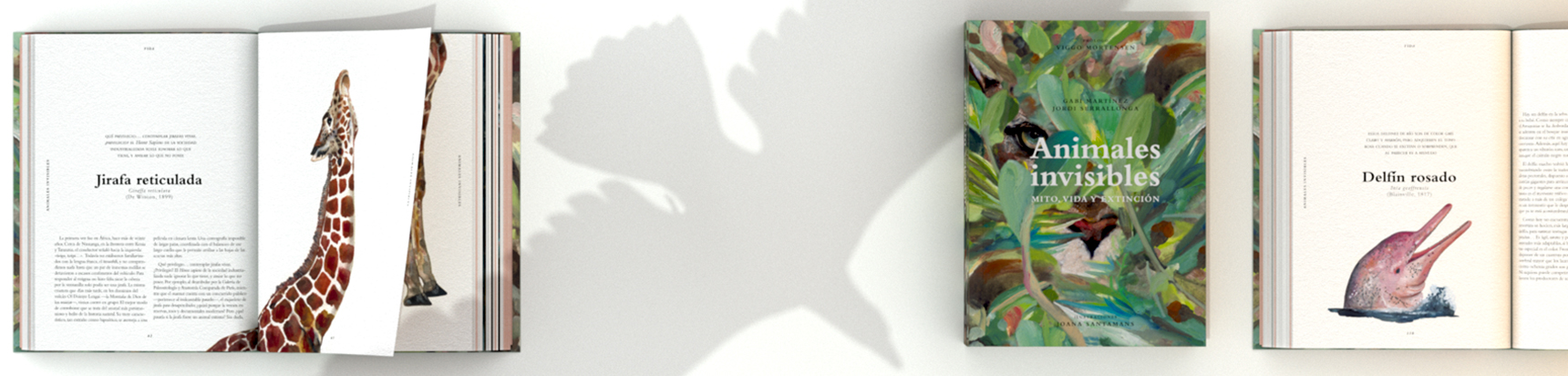 Animales Invisibles, de la mano del escritor y viajero Gabi Martínez, y el arqueólogo, naturalista y explorador Jordi Serrallonga, con las ilustraciones de la artista Joana Santamans, describe tanto a animales extintos a los cuales ya no podemos observar, como a aquellos animales vivos que no vemos o que son muy difíciles de avistar debido a su forma de vida y la acción perjudicial de nosotros, los seres humanos, sobre ellos y sus ecosistemas. Este libro expone conceptos y datos académicos relacionados a las ciencias naturales con un lenguaje asequible para el lector que no sea especialista. Tiene una vertiente naturalista y literaria, siendo un catálogo de lo que hubo y pudo haber, de lo que pueda existir y desearíamos descubrir